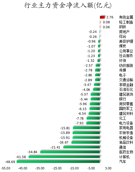 从行业板块来看,申万所属的31个一级行业,今日仅有有色金属、轻工制造、钢铁3个行业板块主力资金呈现净流入,净流入金额分别为2.76亿元、0.08亿元、0.06亿元。28个行业板块主力资金呈现净流出,其中,汽车行业板块主力资金净流出最多,净流出金额为48.69亿元;行业板块主力资金净流出靠前的还有计算机、医药生物、通信、食品饮料、机械设备、农林牧渔,净流出金额分别为41.58亿元、34.84亿元、21.41亿元、16.67亿元、15.91亿元、15.89亿元。