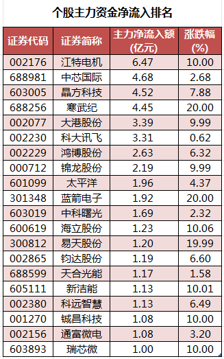 个股来看,今日有1697个股获主力资金净流入,其中,20股获主力资金净流入超1亿元。江特电机获主力资金净流入最多,净流入金额为6.47亿元;主力资金净流入居前的个股还有中芯国际、晶方科技、寒武纪、大港股份、科大讯飞,流入金额分别为4.68亿元、4.52亿元、4.45亿元、3.39亿元、3.31亿元。
