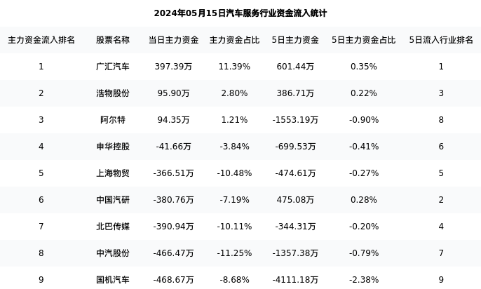 从主力资金流向来看,汽车服务行业今日主力资金流入7853.59万元,在所有申万二级行业中排名:103/131。
