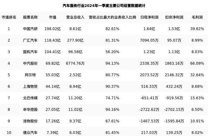 浩物股份最新报告期数据为一季度,下表汇总了汽车服务行业内市值靠前的公司一季度主要经营数据