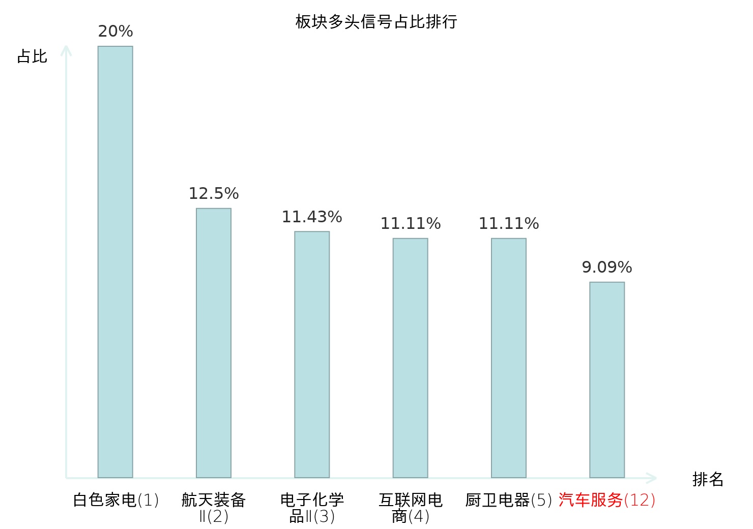 全市场所有行业板块中主力多头信号占比排名中,白色家电板块位居第一。航天装备Ⅱ板块名次提升最快,较昨日上升118位。