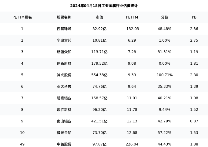 从估值角度看:中色股份最新市盈率PETTM为226.04,在行业内排名49/59,处于44.43分位。