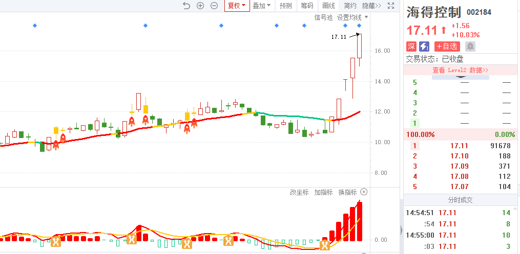 1)海得控制-四维操盘-近期出现火箭信号且底部量柱由绿转红