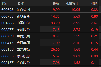 上证报中国证券网讯 11月12日早盘,零售板块表现强势,截至9时33分,东百集团涨停走出3连板,新华百货涨逾5%,中国中免、友阿股份、中百集团、合百集团等跟涨。