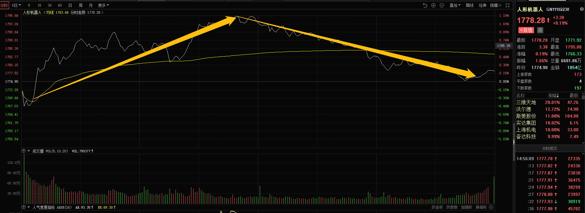 机器人板块和CPO一样,相较中午都是呈现一个冲高回落的态势,午后的回落基本吞噬了日内全部涨幅,显示短期上攻动能不足、抛压加重。尤其是今天涨幅居前的人气股长盈精密的小作文被大家扒出,数字稍显夸张,短期也会影响机器人板块的情绪,因此明天需注意。
