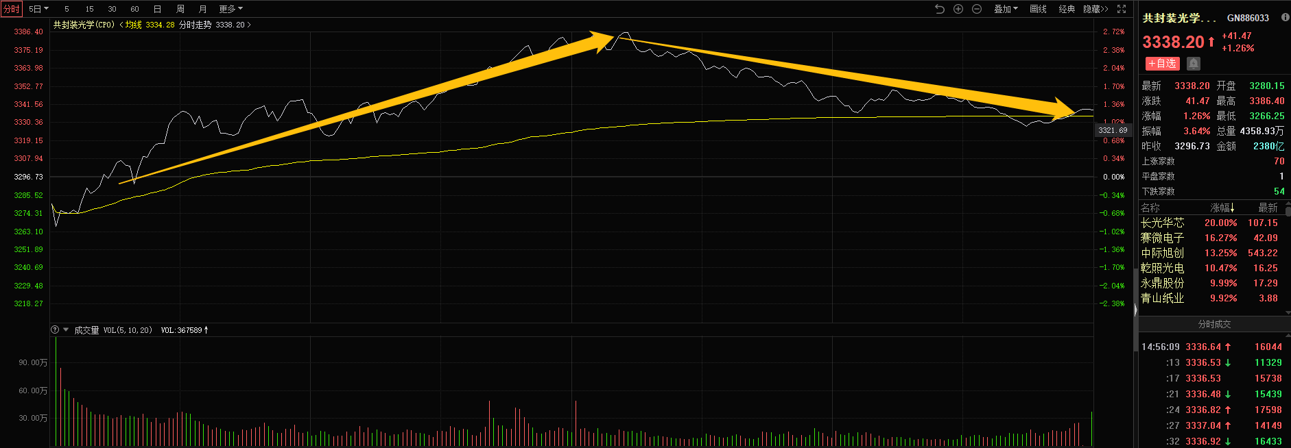 创业板的强势上午我们也分析了主要是CPO的易中天+胜宏科技+阳光电源带的,而CPO板块指数的走势也基本和几个权重股的走势如出一辙。买盘动能基本都集中在上午,再有就是中午开盘那会的集中冲高,随后高点普遍都是回落的。目前算力硬件的分歧还是很大的,一部分人觉得贵,不会再涨,一部分人认为在英伟达的逻辑支撑失去后,还有谷歌的支撑,因此继续看好,看好的人多是在车上的人,不看好的则是没有底仓的,这个位置确实可能风险大于机会,没有的人还是少动多看。我们也反复提示大家算力硬件适合低吸,不适合追涨。而且短期这种缩量的背景下,持续性也很受考验,往往大涨之后又是一次震荡回调。