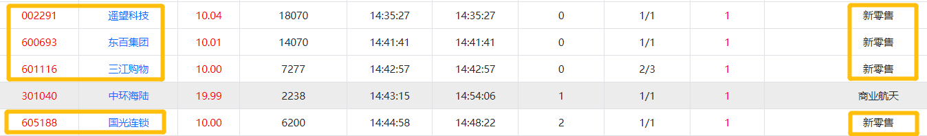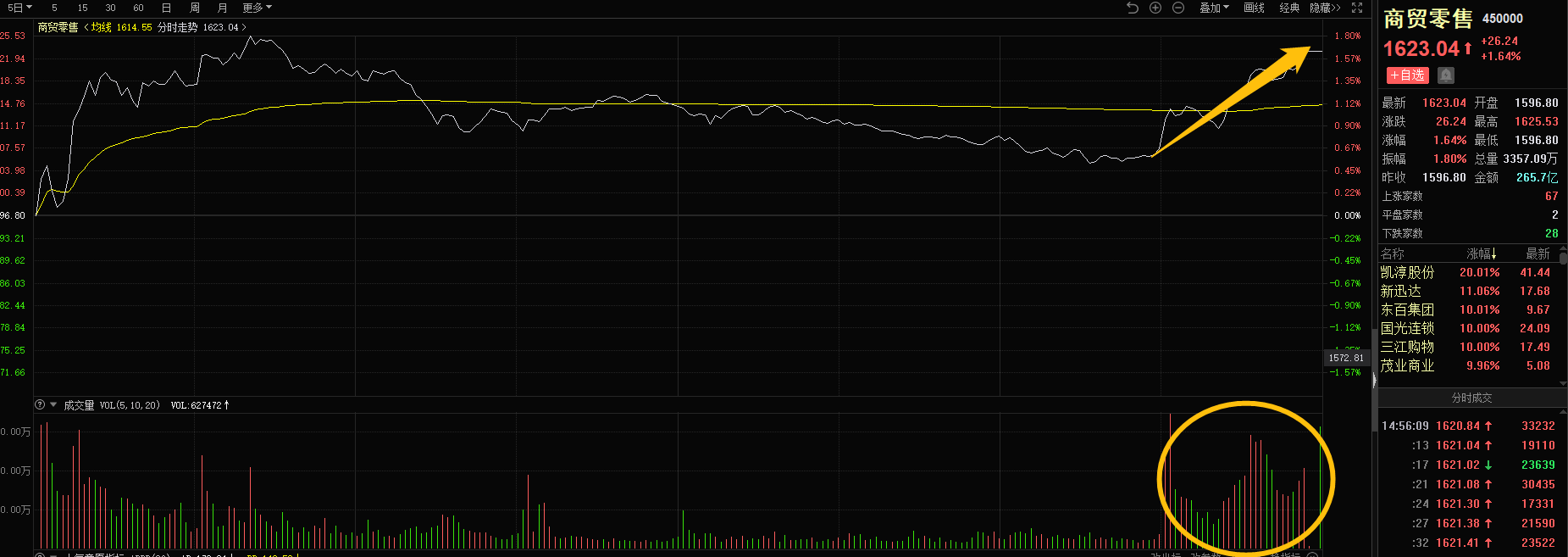 尤其是新零售方向的个股,从板块分时可以看出明显的量能放出。板块一下激增4只涨停板,网红经济中的遥望科技一根直线拉升。东百集团、三江购物、国光连锁纷纷上板。国芳集团股价一度触及涨停,涨超9%+,中百集团、中央商场、步步高这些前期比较有辨识度的个股也都是冲高大涨的。大家会发现一般这种突发的消息一出来,拉升的大多数毕竟熟知的一些常见人气股。至于消费零售这个方向,由于是尾盘偷袭,属于信的早信早上,不信的人宁愿不看,明天如果高开比较多的话,则要注意今天尾盘投机的资金兑现,消费的持续性,还是难看好的。