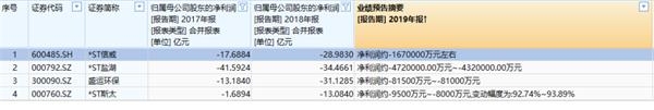 而根据2017年、2018年两年亏损,2019年业绩预亏的情况来看,*ST信威、*ST盐湖、盛运环保、*ST斯太也面临着暂停上市风险。