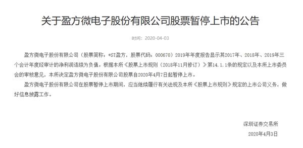 4月3日下午,深交所公告,*ST盈方2019年年度报告显示其2017年、2018年、2019年三个会计年度经审计的净利润连续为负值。根据相关规定以及本所上市委员会的审核意见,决定*ST盈方股票自2020年4月7日起暂停上市。