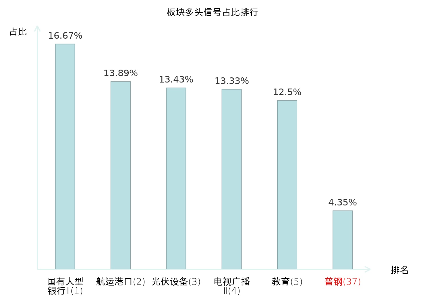全市场所有行业板块中主力多头信号占比排名中,国有大型银行Ⅱ板块位居第一。国有大型银行Ⅱ板块名次提升最快,较昨日上升124位。