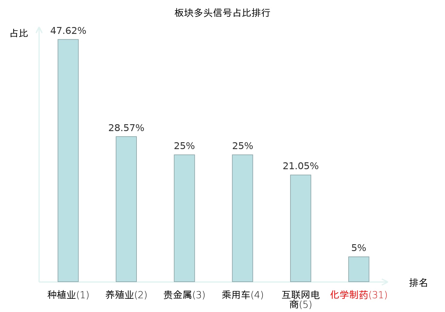 全市场所有行业板块中主力多头信号占比排名中,种植业板块位居第一。乘用车板块名次提升最快,较昨日上升115位。