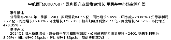 值得注意的是:2024年05月长江证券的王贺嘉/赵智勇/杨继虎分析师,首次发布关于中航西飞的研究报告,标题为:中航西飞(000768):盈利提升业绩稳健增长 军民并举市场空间广阔。