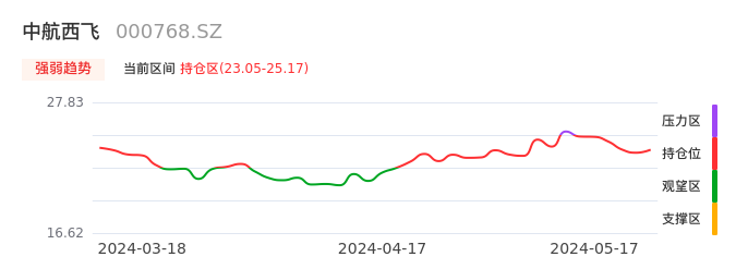 我们来看一下该股的九方特色指标强弱趋势的情况:中航西飞自05月10日从压力区回到持仓区。股价在持仓区盘整一段时间后,目前有启稳迹象。后续重点关注上方压力位:25.17元是否能重新上攻。