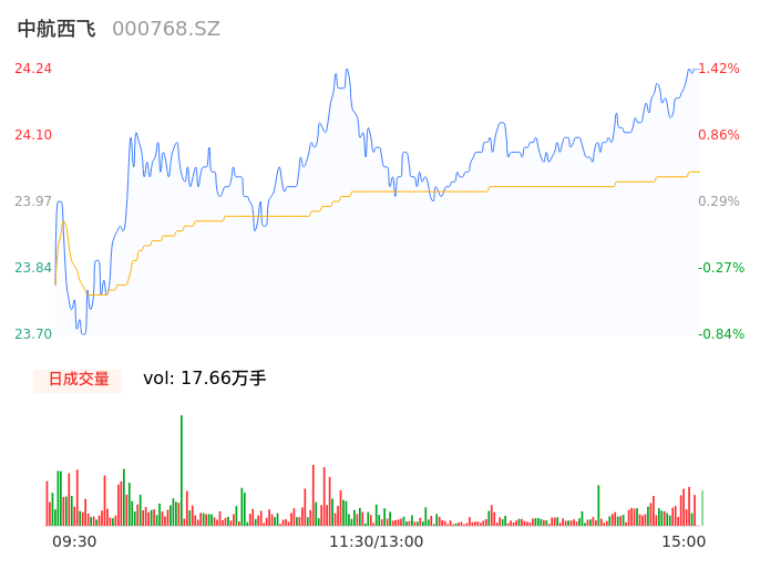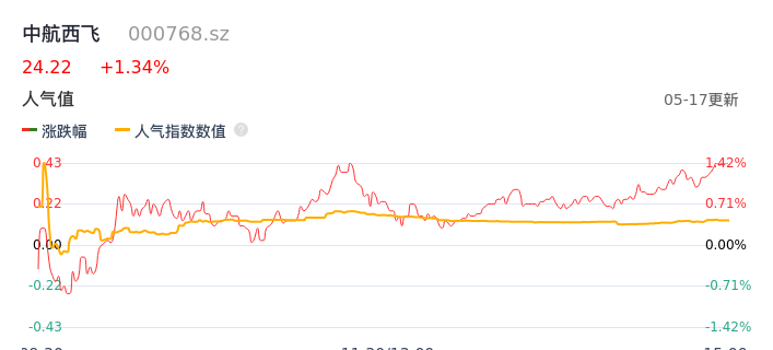 05月17日,中航西飞收报24.22,股价涨幅1.34%,成交金额4.24亿元,换手率0.64%。