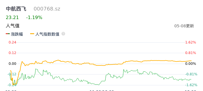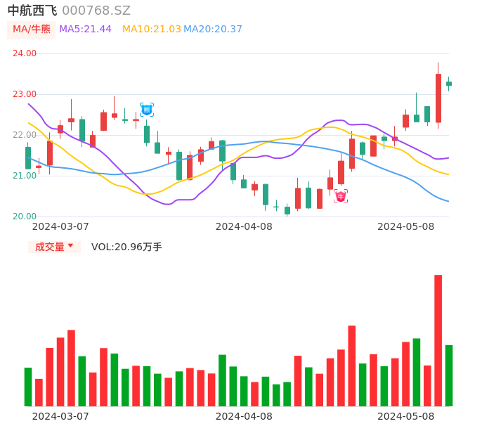 05月08日,中航西飞收报23.21,股价涨幅-1.19%,成交金额4.87亿元,换手率0.76%。
