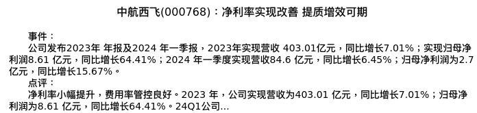 值得注意的是:2024年05月东北证券的王凤华/刘丹阳分析师,首次发布关于中航西飞的研究报告,标题为:中航西飞(000768):净利率实现改善 提质增效可期。