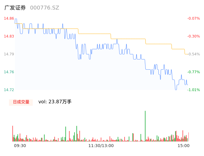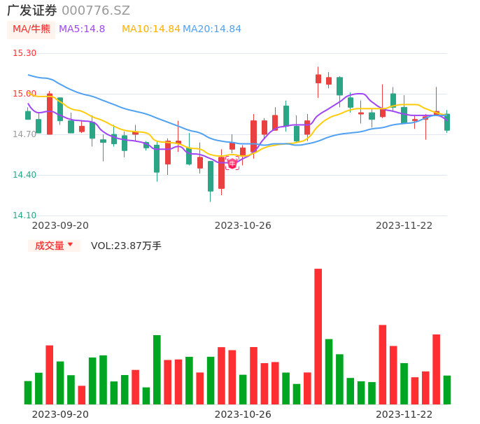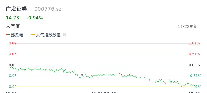 11月22日,广发证券收报14.73,股价涨幅-0.94%,成交金额3.53亿元,换手率0.40%。