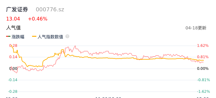 04月18日,广发证券收报13.04,股价涨幅0.46%,成交金额4.07亿元,换手率0.53%。