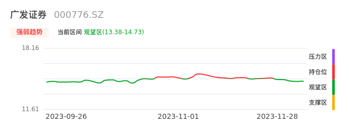 我们来看一下该股的九方特色指标强弱趋势的情况:广发证券自11月22日从持仓区下穿到观望区。股价近期持续下跌后,短期出现止跌迹象。后续重点关注能否再次站上多空分界点:14.73元。如未能有效突破则可能进入新一轮空头行情。
