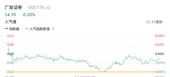 11月23日,广发证券收报14.70,股价涨幅-0.20%,成交金额4.97亿元,换手率0.57%。