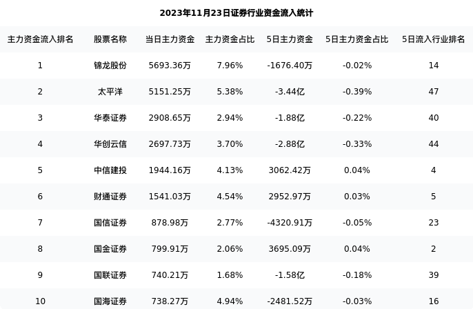 广发证券今日净流出1.04亿元,主力占比20.99%,在行业内排名:48/50;5日净流出2.04亿元,主力占比0.23%,在行业内排名:42/50。