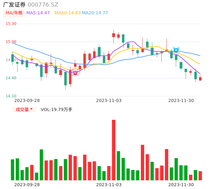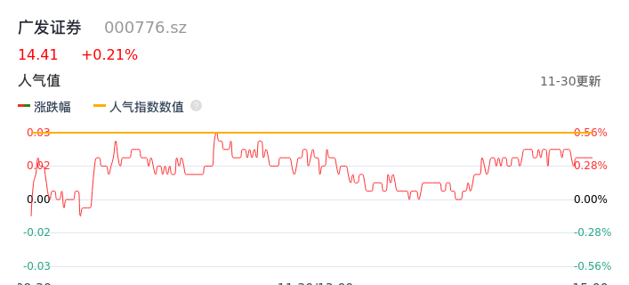 11月30日,广发证券收报14.41,股价涨幅0.21%,成交金额2.85亿元,换手率0.33%。