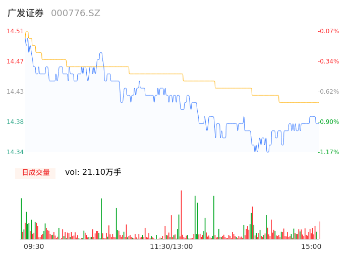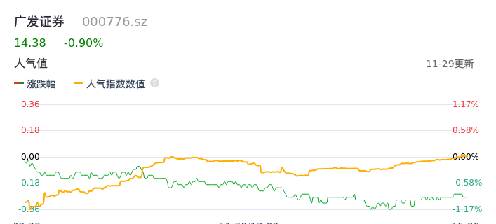 11月29日,广发证券收报14.38,股价涨幅-0.90%,成交金额3.04亿元,换手率0.36%。