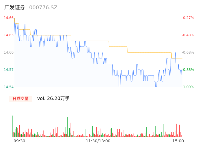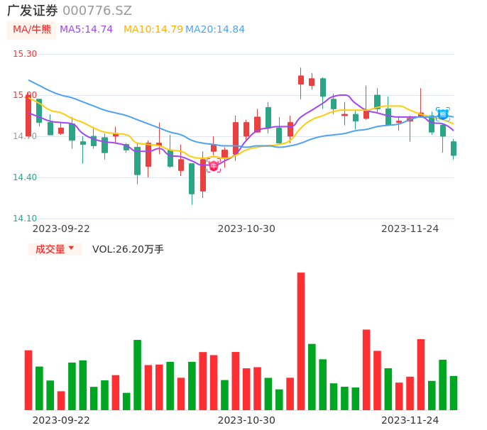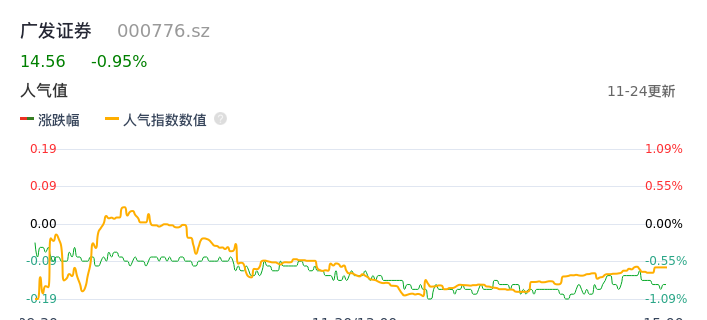 11月24日,广发证券收报14.56,股价涨幅-0.95%,成交金额3.82亿元,换手率0.44%。