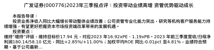 值得注意的是:2023年11月国泰君安的刘欣琦/牛露晴/王思玥分析师,首次发布关于广发证券的研究报告,标题为:广发证券(000776)2023年三季报点评:投资带动业绩高增 资管优势驱动成长。