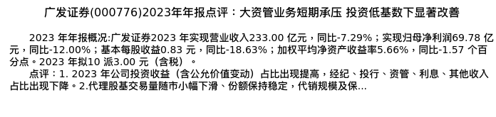 值得注意的是:2024年04月中原证券的张洋分析师,首次发布关于广发证券的研究报告,标题为:广发证券(000776)2023年年报点评:大资管业务短期承压 投资低基数下显著改善。