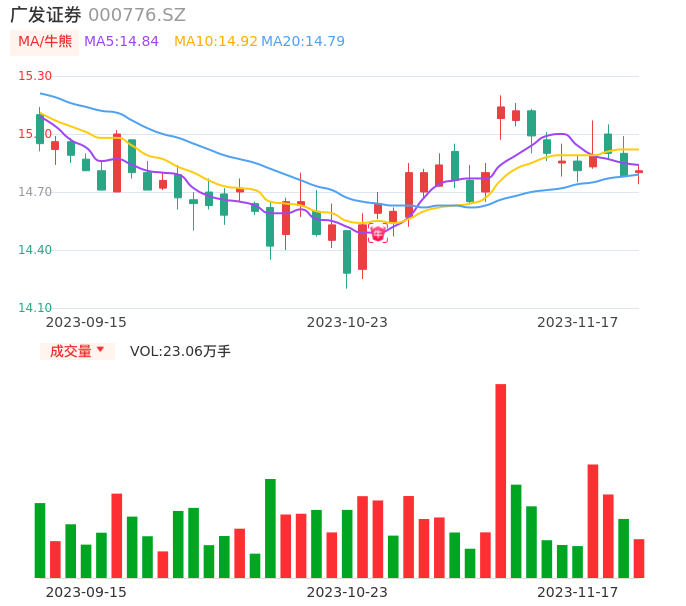 11月17日,广发证券收报14.81,股价涨幅0.20%,成交金额3.41亿元,换手率0.39%。