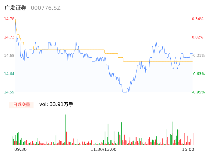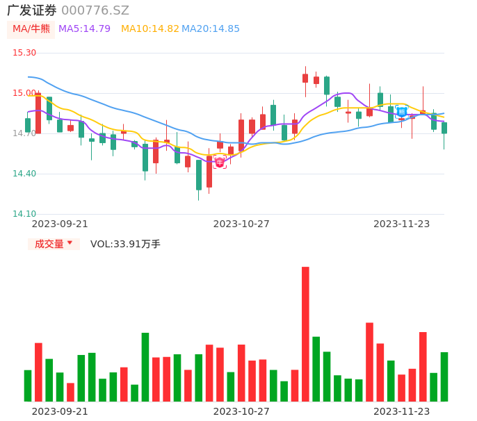 11月23日,广发证券收报14.70,股价涨幅-0.20%,成交金额4.97亿元,换手率0.57%。