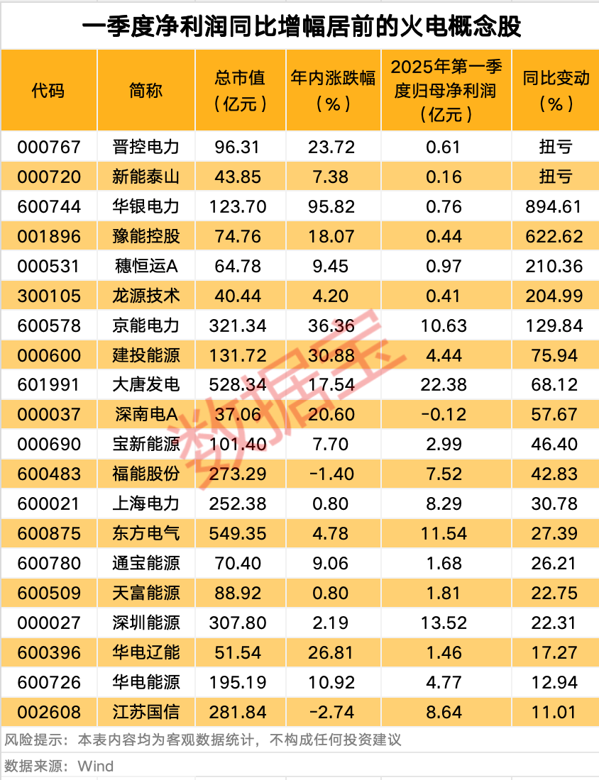 据证券时报·数据宝统计,火电概念股有近40只,年内股价平均上涨7.91%,华银电力、京能电力、建投能源的股价涨幅居前,年内均上涨超30%,华银电力股价涨幅居首,年内累计上涨95.82%,公司是大唐集团旗下湖南省火电龙头,主营火力发电业务,同时经营水电、风电、太阳能业务以及电力销售业务。