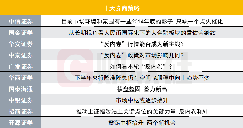 中信证券策略团队发布报告称,目前的市场环境和氛围有一些2014年底的影子,包括:投资者在港股、小微盘和产业赛道已经积累了一定的赚钱效应,新发产品开始温和回暖;非金融板块盈利预期趋近于底部,投资者耐心有所好转,信心还有待恢复;反内卷和提振内需成为政策目标的明牌,具体政策的出台和思路调整只是时间问题,“十五五”规划可能展示新的政策路径。市场目前缺的只剩一个点火的催化,可能是中美政策超预期,或者科技产业新变化。从配置角度来看,中报季我们还是维持三条思路,一是具备超强产业趋势特征的行业,关注AI和创新药;二是业绩和估值匹配驱动的行业,关注通信和电子中的北美算力链、有色和游戏;三是带有一定主题和持仓博弈性质的行业,关乎军工和反内卷相关的新能源。整体而言,有色、AI硬件、创新药、游戏和军工的轮动可能还是中报季的主旋律。