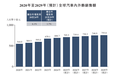 全球汽车内外饰市场的销售额由2020年的人民币5,440亿元增加至2024年的人民币6,887亿元,复合年增长率为6.1%。于预测期间,预计全球汽车内外饰市场将进一步增加至2029年的人民币7,558亿元,2025年至2029年的复合年增长率为1.7%。