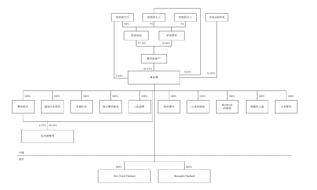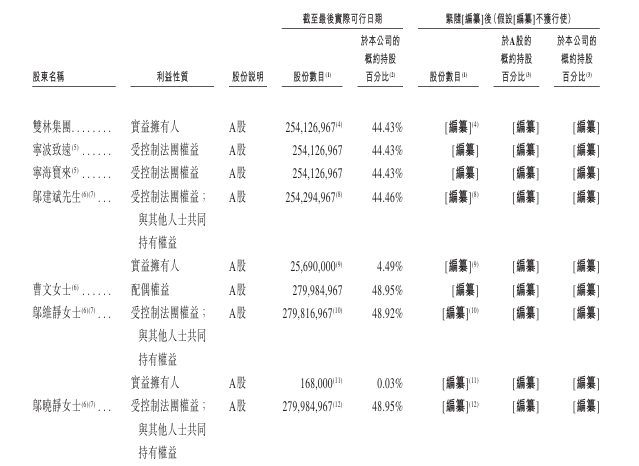 双林集团由宁波致远及宁海宝来分别持有57.14%及42.86%。宁波致远由邬建斌先生(公司执行董事、董事长兼总经理)、邬维静女士(非执行董事及邬建斌先生胞姊)以及邬晓静女士(邬建斌先生胞姊)分别持有90%、5%及5%。宁海宝来由邬建斌先生、邬维静女士及邬晓静女士分别持有90%、5%及5%。因此,控股股东共同有权行使占已发行股本总额约48.95%的投票权。