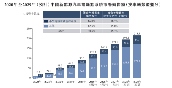 小型电动车新能源系统占中国汽车零部件市场总量的0.4%。2024年,中国小型电动车新能源系统的销售额为人民币176亿元。预计2029年将达到人民币441亿元,2025 年至2029年的复合年增长率为18.7%。