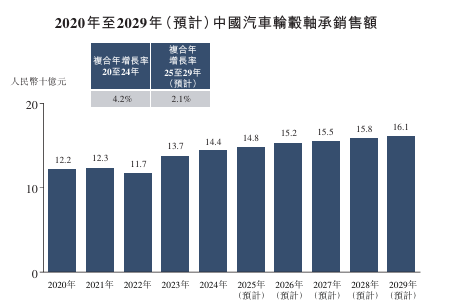汽车轮毂轴承占中国汽车零部件市场总量的0.3%。中国汽车轮毂轴承的销售额由 2020年的人民币122亿元增加至2024年的人民币144亿元,复合年增长率为4.2%。于预测期间,预计中国汽车轮毂轴承市场将进一步增加至2029年的人民币161亿元,2025 年至2029年的复合年增长率为2.1%。
