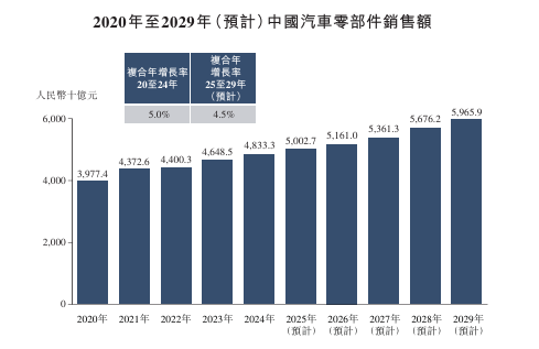 中国汽车零部件的销售额由2020年的人民币39,774亿元增加至2024年的人民币48,333亿元,复合年增长率为5.0%。于预测期间,预计中国汽车零部件的市场规模将进一步增加至2029年的人民币59,659亿元,2025年至2029年的复合年增长率为4.5%。