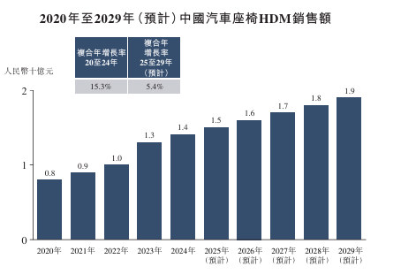 汽车座椅HDM占中国汽车零部件市场总量的0.03%。中国汽车座椅HDM市场的销售额由2020年的人民币8亿元增加至2024年的人民币14亿元,复合年增长率为15.3%。于预测期间,预计中国汽车座椅HDM市场将进一步增加至2029年的人民币19亿元, 2025年至2029年的复合年增长率为5.4%。