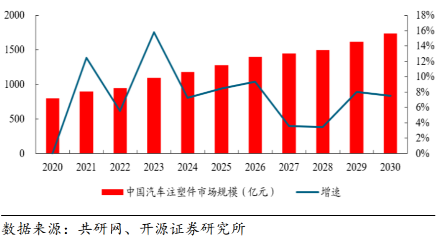 新能源汽车轻量化趋势持续驱动注塑件市场需求增长。注塑件具有密度低、性能优和成本低的显著优势,是汽车领域主流轻量化产品,汽车用材料中用量仅次于金属的材料,正逐步取代传统金属零部件。根据共研网,预计到 2030年国内汽车塑料件市场规模为 1741.91 亿元,新车配套市场规模为 1629.32 亿元,更新维护市场规模为 112.59 亿元。