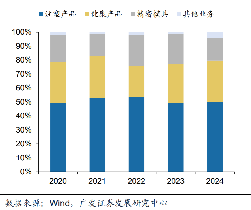 目前,公司已经形成了由精密注塑模具、注塑件以及以空气净化器为主的健康产品构成的产品线,可为汽车、健康家电、户外家居、电子等行业领域客户提供多样化、一站式的产品和服务。2024年精密注塑模具、注塑产品、健康产品分别占比总营收的16%、50%、30%。