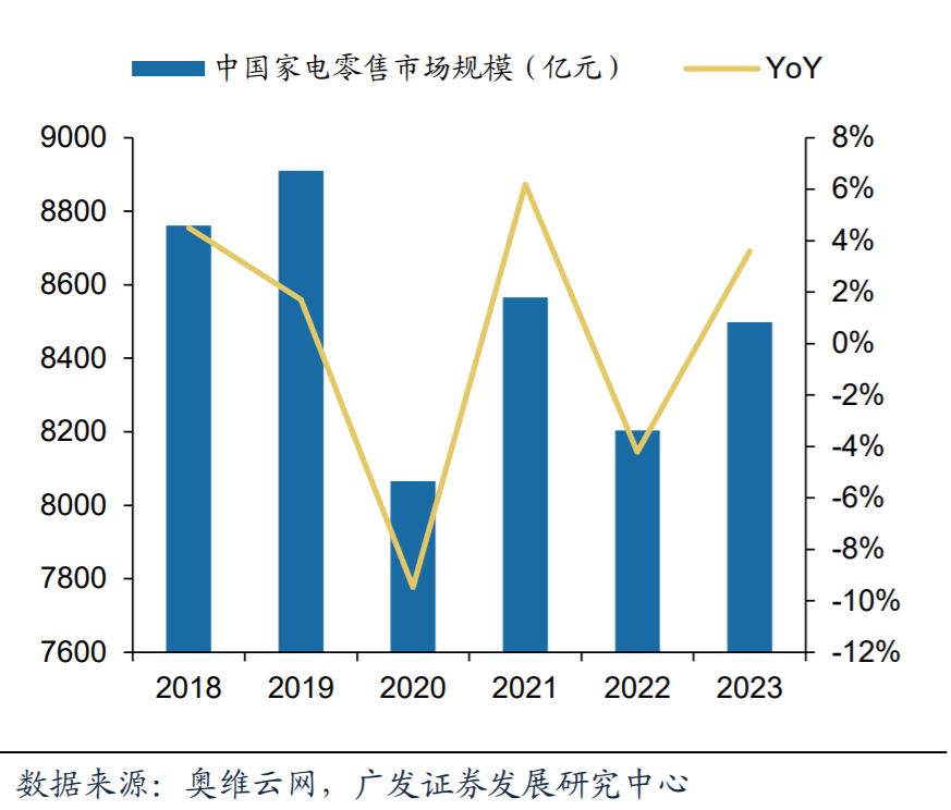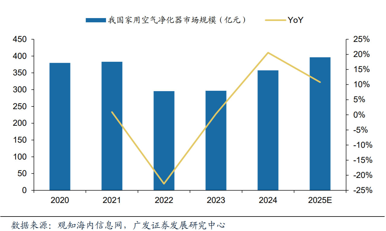 健康家电类产品需求日益增长,超过家电整体规模增速。根据奥维云网,2023年我国家电零售市场整体规模达8498亿元,同比增长3.58%。家用空气净化器市场规模不断扩大。根据观知海内信息网统计 及预测,2025年我国家用空气净化器市场规模将达到396亿元,同比增长10.8%。