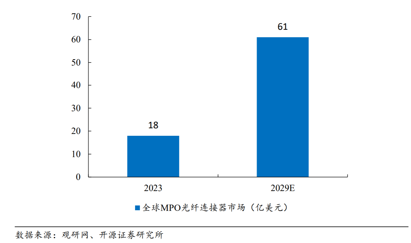 MPO 市场空间有望超 60 亿美元。随着云计算、大数据和人工智能等技术的兴起,数据中心需要处理大量的数据传输和存储,对 MPO 光纤连接器需求持续提升,此外,数据中心传输速率的升级背景下,800G、1.6T 高速光模块用量大幅提升,配套 16/24 芯 MPO、32/48 芯 MPO 用量增长。相较于 8/12 芯 MPO,高芯数 MPO 单价提升,由此,全球 MPO 光纤连接器市场前景广阔,预计 2029 年行业规模达 61 亿美元,2023-2029 年 CARG 达 22.6%。