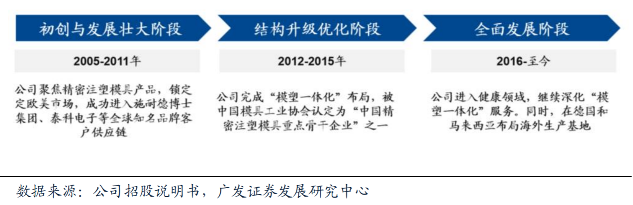 唯科科技成立于2005年,成立之初专注于精密注塑模具业务,确立了以欧美等海外市场为主的销售策略。通过多年的生产实践,公司逐步掌握了精密注塑模具设计和制造以及注塑成型的关键核心技术,依托技术Know-How自2016年起进入全面发展阶段,并逐步将业务向下游拓展至注塑件以及健康产品业务,开启全球化经营布局。