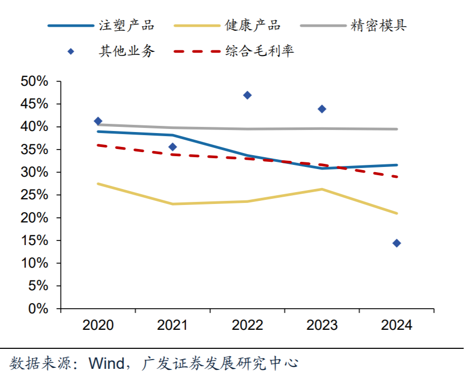 从毛利率来看,公司精密模具和注塑产品的毛利率高于综合毛利率,24年分别达到39.5%和31.6%,精密模具毛利率稳定,注塑产品随着放量与产品结构的变化毛利率有小幅下滑;健康产品的毛利率较低,24年为20.9%。