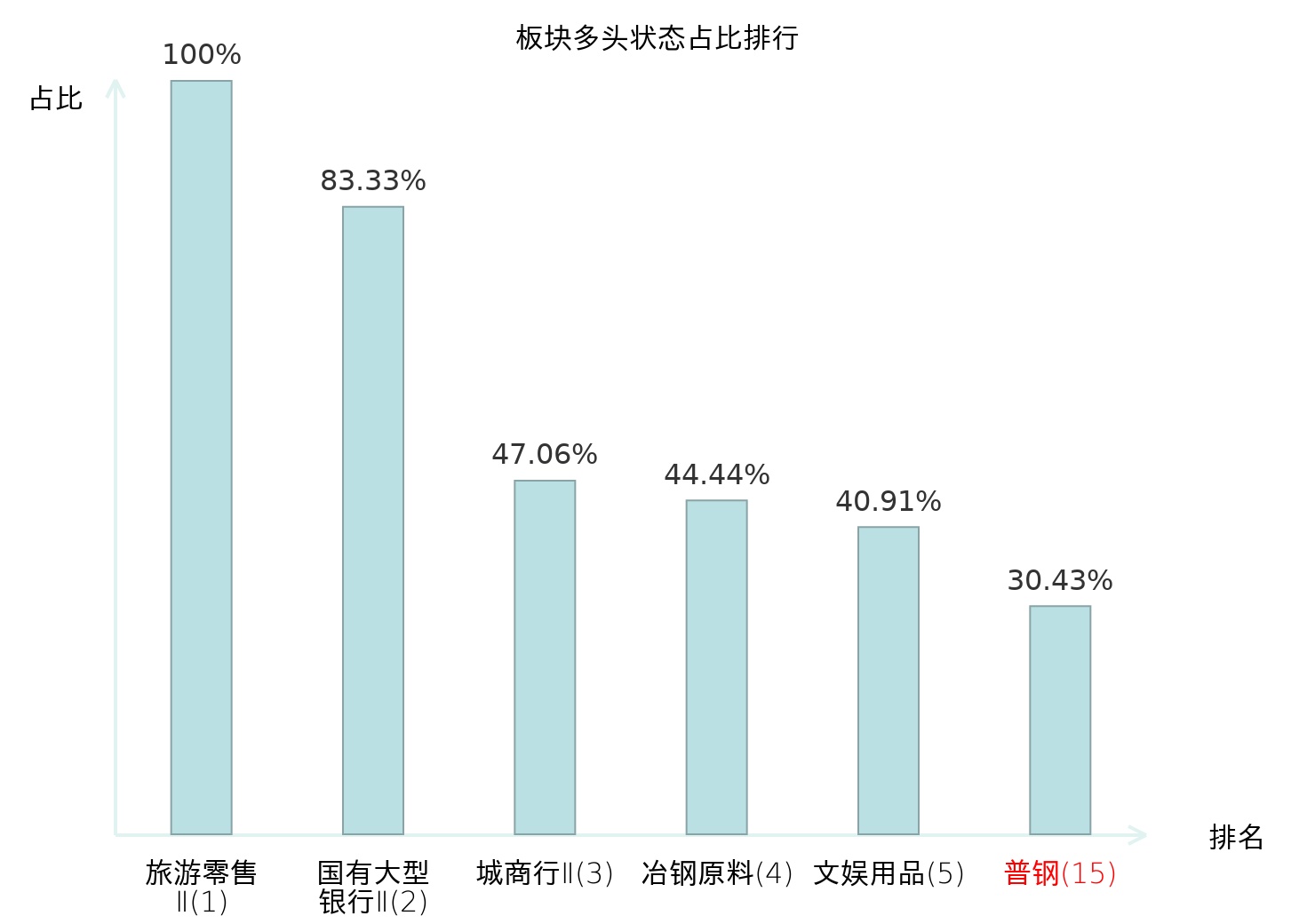 全市场所有行业板块中主力多头状态占比排名中,旅游零售Ⅱ板块位居第一。旅游零售Ⅱ板块名次提升最快,较昨日上升130位。