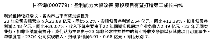 值得注意的是:2024年04月天风证券的鲍荣富/王涛/王雯分析师,首次发布关于甘咨询的研究报告,标题为:甘咨询(000779):盈利能力大幅改善 募投项目有望打造第二成长曲线。