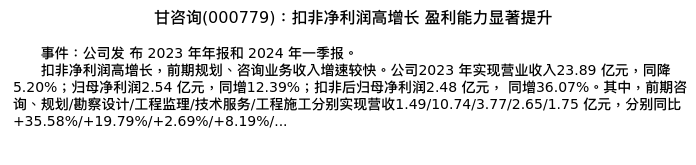 值得注意的是:2024年04月中国银河的龙天光分析师,首次发布关于甘咨询的研究报告,标题为:甘咨询(000779):扣非净利润高增长 盈利能力显著提升。