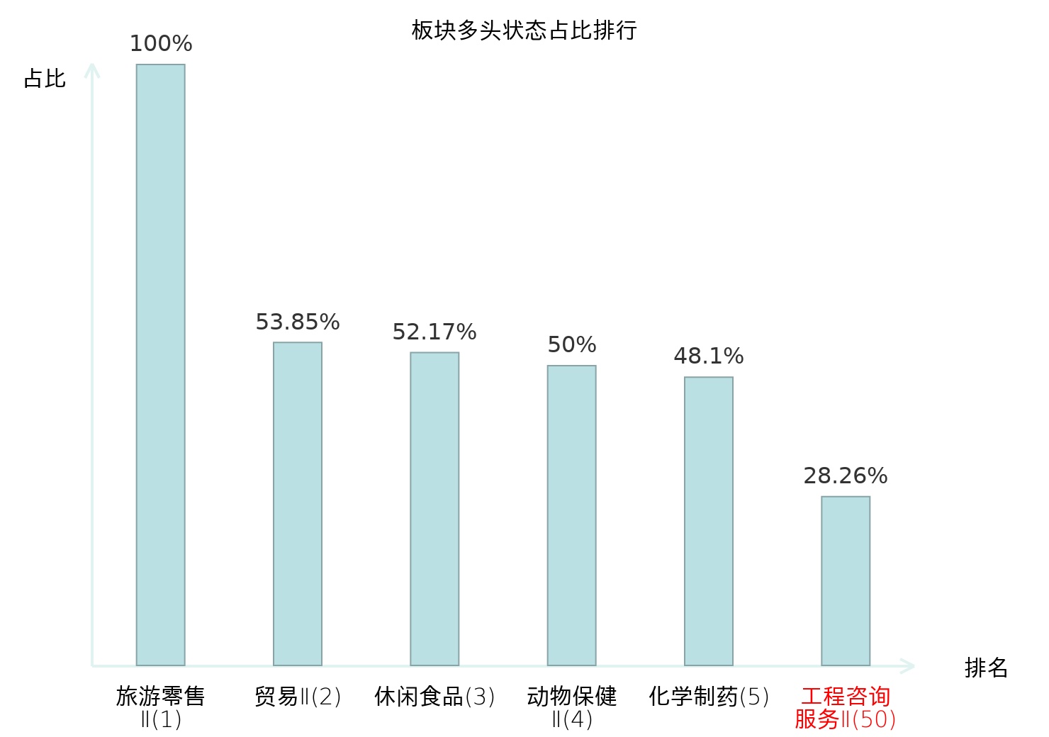 全市场所有行业板块中主力多头状态占比排名中,旅游零售Ⅱ板块位居第一。白酒Ⅱ板块名次提升最快,较昨日上升47位。
